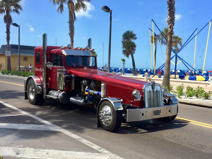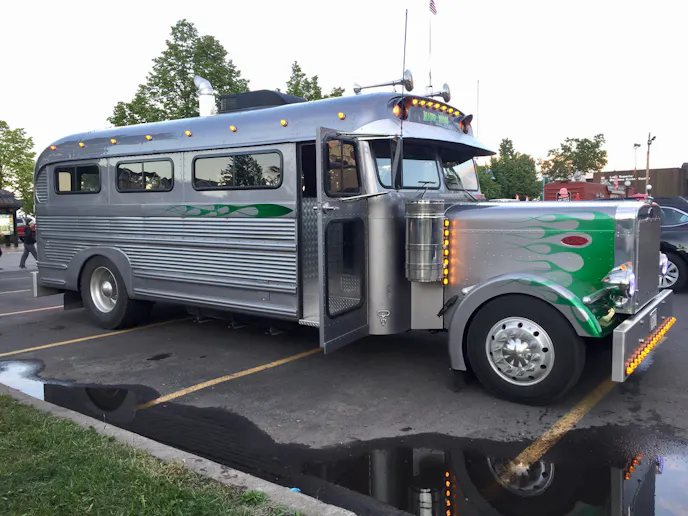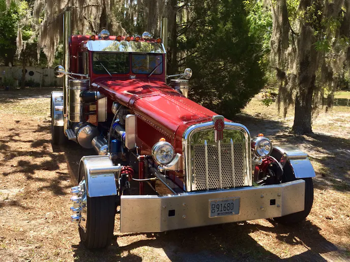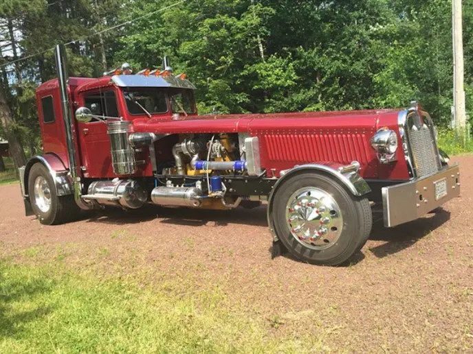 The Peterbilt front end was chopped, and its fenders were given a profile to suit smaller tires. All that was left uncut were the top and grille. An 8.3-liter Cummins from a Freightliner was used to power the vehicle, and it currently makes about 600 horsepower to a custom-made Allison transmission.