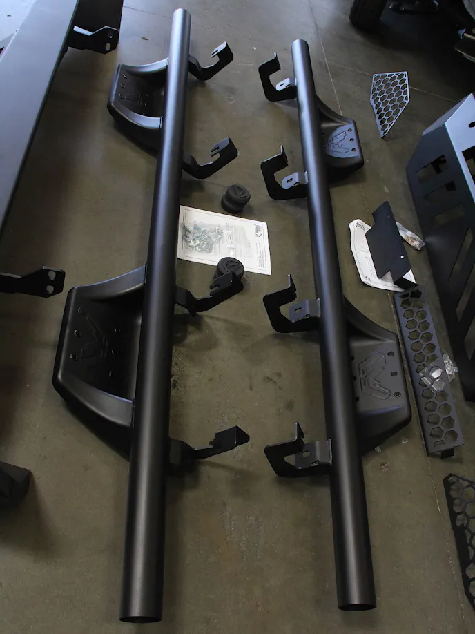 Looking at our brand-new steps sitting on the shop floor, we mused over how this patented cab-length design will likely be a breeze to install due to their OEM bolt-on design. Complete with high-grade mounting hardware, straightforward instructions, branded rubberized end caps, a two-stage matte black powder coating, and a 70-pound curb weight, this set looks to be an all-around winner.