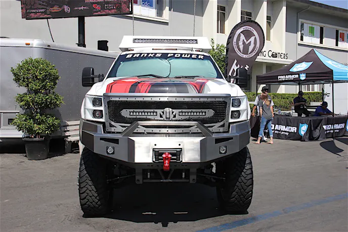 Under the hood, the 6.6-liter LMM Duramax has a host of upgrades, all provided by Banks Power. These include a Double-Shot water-methanol injection system, a Ram-Air intake, Big Hoss injectors, PowerMax Stage II turbocharger, SpeedBrake exhaust brake, and Monster exhaust. Banks also has a billet torque converter in the transmission, while Maximum Transmissions did the billet input shaft.