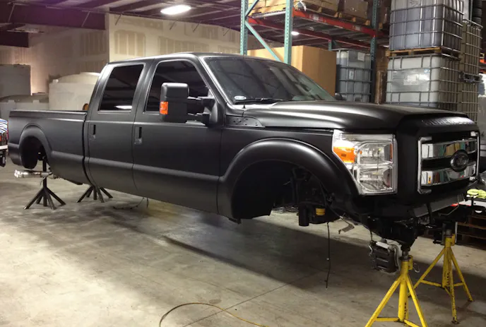 The base truck is a 2012 Ford F-250 Crew Cab Long Bed 4×4. There have been 3,500 miles put on the truck since it was built. The entire suspension was pulled off and a Kelderman 8 to 10” 4 link lift kit was added that is controlled by AccuAir’s e-Leveling system. The Kelderman kit features dual Viair 444 air compressors and dual 3 gallon air tanks. To keep the ride soft and comfortable, a set of custom black Sway-A-Way remote reservoir shocks were added.