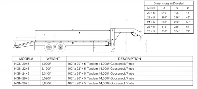 The lightest duty (if you can call it that) gooseneck trailer is their 14GN series. These are roughly 14,000 lbs trailer. Their G.V.W.R (Gross Vehicle Weight Rating) is 15,900lbs. Now this doesn’t mean that you can put 15,900lbs on the trailer. It means that these trailers are rated for a combined (trailer plus load) weight of 15,900lbs. To calculate what they actually can carry, you have to first determine how long of a trailer you need. As you increase length, you actually decrease their load capacity because the weight of the trailer itself is increasing. The shortest (20’ deck with a 5’ tail) comes in a 4,920 lbs and the longest (28’ deck with a 5’ tail) weights 5,880 lbs. So, this line of trailers can actually carry 10,980 lbs (15,900-4920) to 10,020 lbs (15,900-5880).