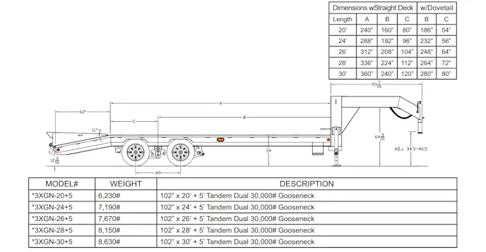 On the other side of the lineup is the 3XGN series. These all carry a 30,000 lbs GVWR rating. They too come in the 20’ plus 5’ tail to 30’ plus 5’ tail. These are tandem axles with dual wheels. To handle the increased load, the frame, cross-members and side rails are all made with larger steel pieces. So, the base weights are, also, heavier. The base weight of the 20’+5’ trailer is 6,230 lbs and the 30’+5’ come in at a whopping 8,630 lbs. So, these super duty gooseneck trailers are capable of carrying a load of 21,370 lbs up to 23,770 lbs.