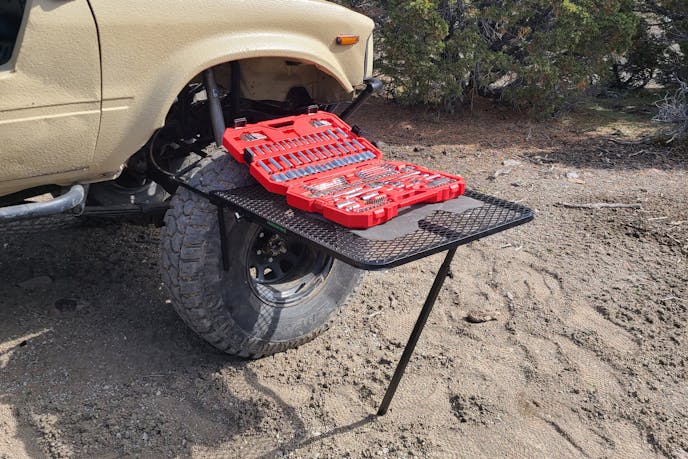 The “Tire Table” uses your truck tire as its main support, making it a stable and flat work surface regardless of the ground conditions. It has an expanded-metal surface, allowing dirt and spills to fall right through. Also, it will not be blown over by the wind. It can also be leveled on the tire even if your vehicle is not level.