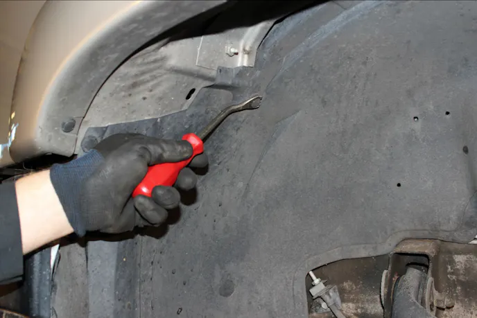 Place a drain pan under the steering gearbox and power steering pump. Both will leak when you start disconnecting the old lines. With these items draining, you can move on to the removal of the front inner fender using your trim panel removal tool. This will give you access to that area.