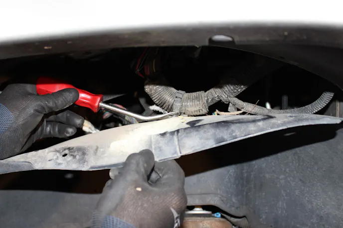 Once all of the retainer clips have been removed, pull the inner fender down slightly to expose the top surface. You will find one or two wiring harnesses that are attached to the top of the inner fender. Use the trim panel removal tool or similar to release them. Finish removing the inner fender to expose the areas where you will be working to change out the power steering lines.