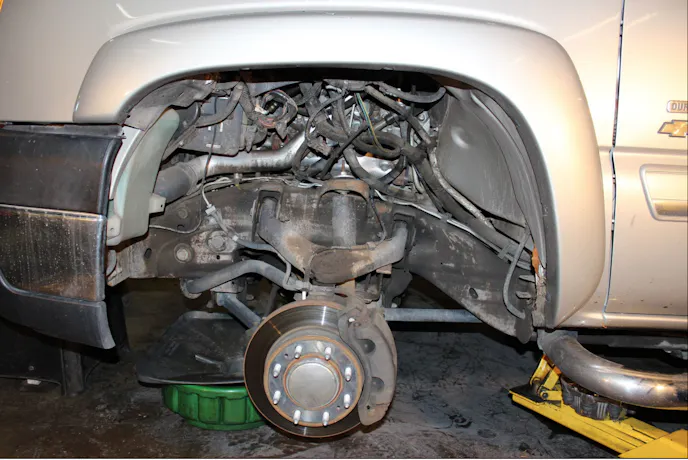 Completing this job is going to require working both inside the driver side front inner fender and on top of the engine through the hood. You are going to start by setting the parking brake and jacking the front of the truck up, followed by removing both front tires. Using appropriately sized jack stands, lower the truck to a level that will safely allow you to work but the truck is level front to back. For safety reasons, Strictly does NOT recommend leaving the truck supported by just a floor jack.