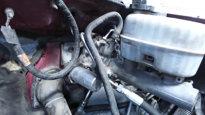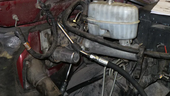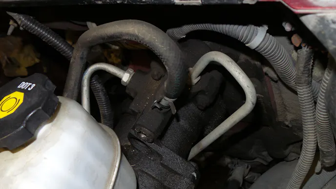 Locate the engine and fender side power steering pressure hoses at the hydro-boost unit. Loosen and disconnect both hoses. Remove both factory power steering hose assemblies from the truck. Closely look at the ends of both assemblies and verify that the O-rings came out with the hoses. If any O-rings are missing, locate and remove them from the hydro-boost, steering gear, or power steering pump before continuing to the next step.