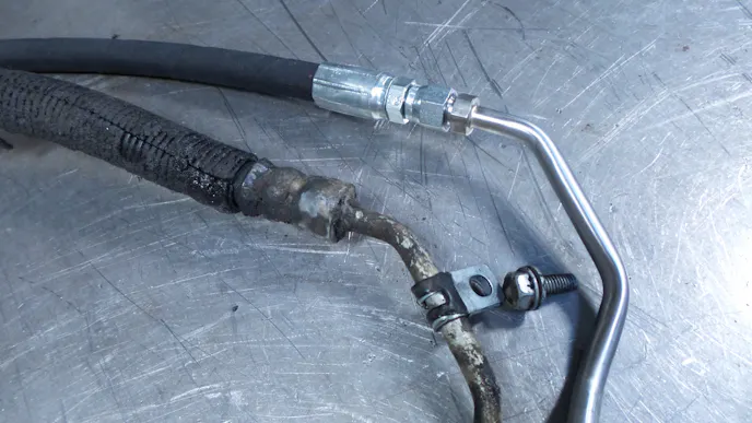 Locate the remaining tube and hose assemblies and loosely attach one end of the hose to the tube. Loosely attach the other end of the hose to the power steering pump tube and then install the remaining tube onto the engine side of the hydro-boost. With these connections finger tight, you should have all the tubing assemblies installed and connected.
