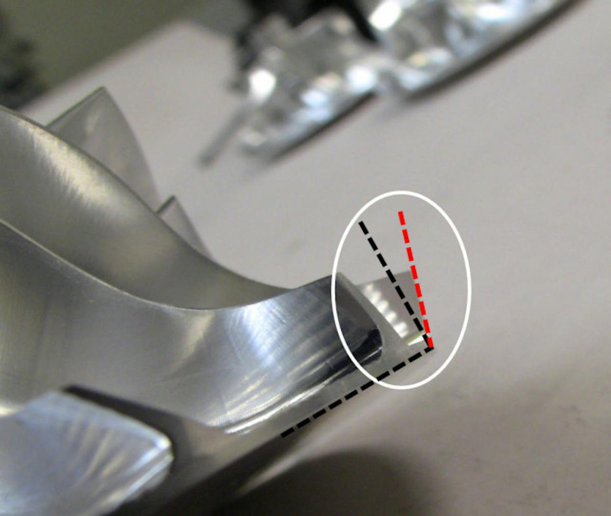 The black doted line represents a standard compressor wheel outer diameter. BorgWarner uses Extended Tip Technology (shown in red) to get a smaller wheel to perform like a larger wheel.