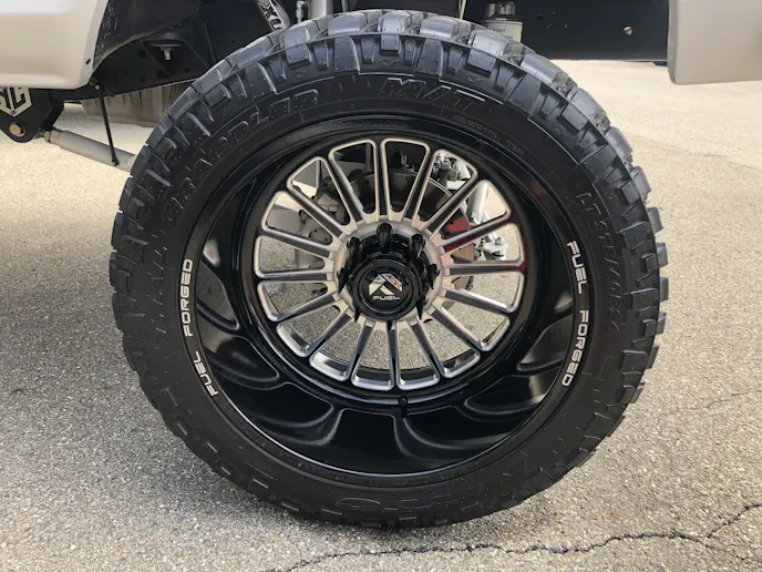 On the outside of the axles are a set of drilled and slotted rotors that are somewhat covered by the monster 24-inch by 14-inch Fuel Forged FF75 wheels. Clark, given his relationship with Nitto Tire, trusts a set of 375 Nitto Trail Grappler tires to get him to and from the show. Riding high, Pearl utilizes a combination of Clark & Smith Fab Suspension, Air Ride, and Fox 2.0 shocks.