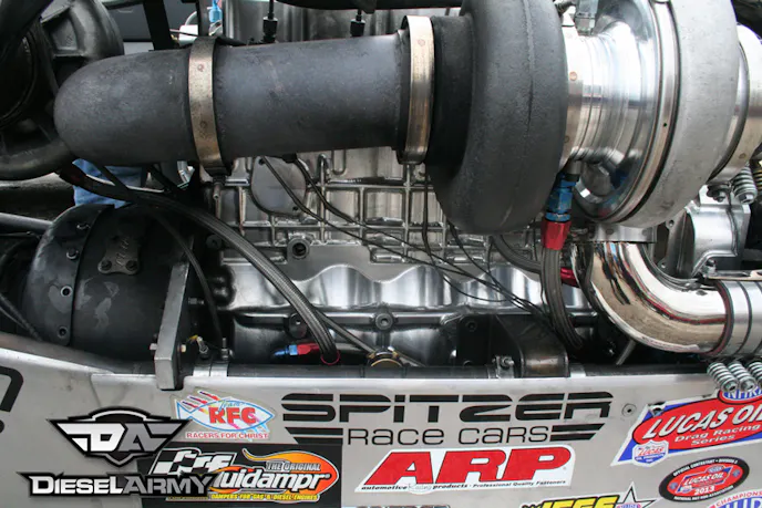Unfortunately, doing their first pass at about 8 p.m. the motor decided not to cooperate. Pulling the truck in to the overhang area of the concession stand, the team thrashed on the engine. Their goal was to do a complete motor swap. They got it completely pulled out, disassembled and the back-up engine that they brought with them back into the truck by 5 a.m. the next morning (using only hand tools). Still at the track, they lined back up and were making passes until 6 a.m., when the track finally closed.