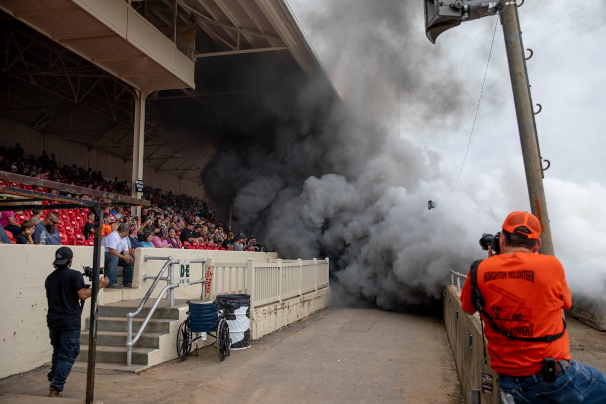 Remember “White Widow” from the dyno competition? Well, he led the burnout competition early with a monster burnout that literally smoked the crowd out so bad that the show was put on hold. I think someone had a little too much fuel and not enough turbo. What do you think?