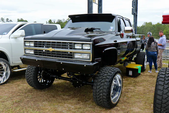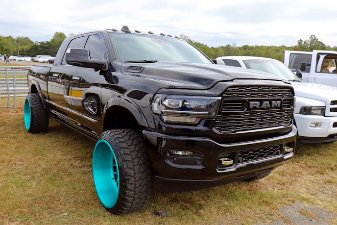 This ominous-looking black new model Ram (left) uses the bright {link=https://www.specialtyforged.com/} Specialty Forged {/link} wheels for a pop of color with great effect. A classic square-body Chevy (right) with a diesel stuffed under the cowl induction hood is a great combo in our book especially when it is a clean crew cab like this one with a lift and big wheels and tires stuffed under the wheel wells.
