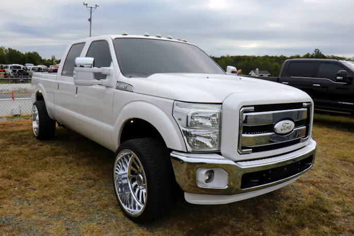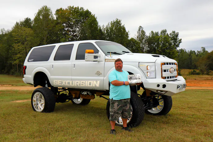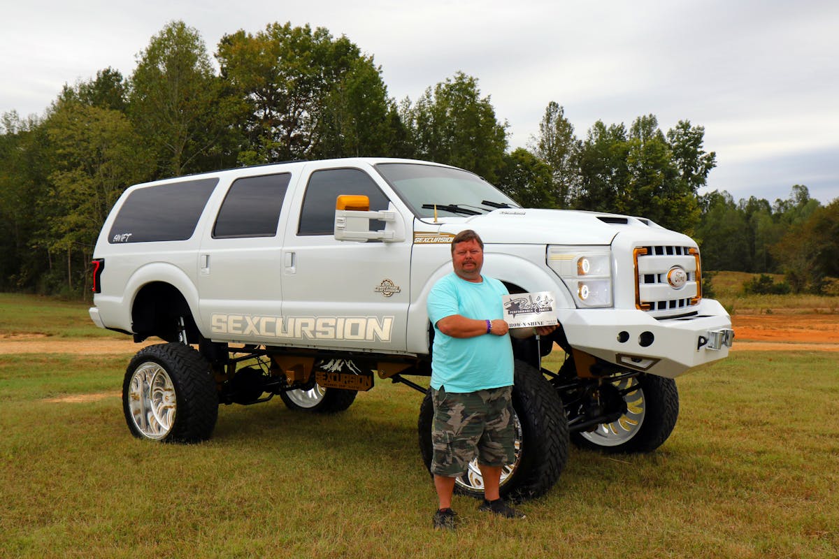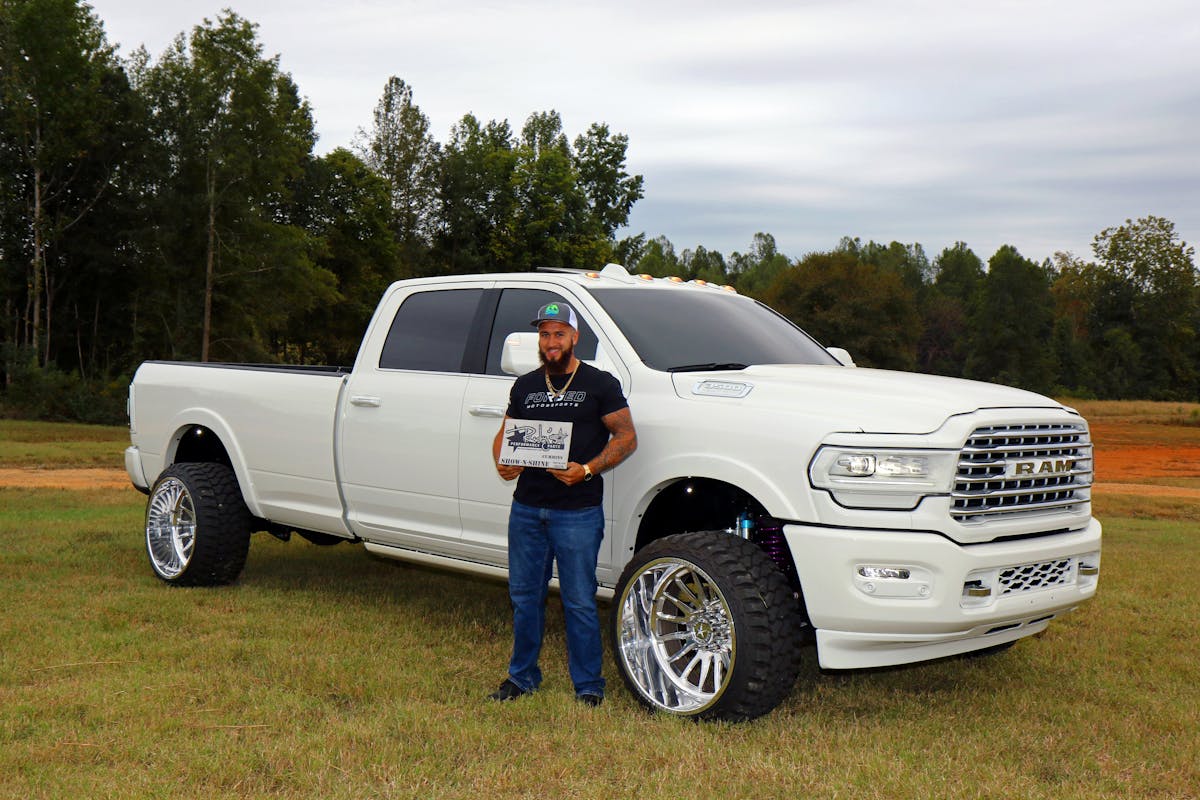 Franklin Williams calls his lifted Ford Excursion (left) the “SEXCURSION King of SUV’s” and it just might be the king of SUV’s with Lambo door hinges front and rear along with the custom air suspension lift mixed in with huge wheels and tires as well as tons of custom paint and powder coating. He proudly holds his Best In Show award as his rig towers in the background. The Best Cummins award was presented to Zachary Zamudio for his super clean fifth-gen Ram 3500 (right). The bright white Ram sports a slick American Force wheel package wrapped in {link=https://www.furytires.com/} Fury {/link} Country Hunter M/T tires along with custom powder coated suspension and {link=http://www.kingshocks.com/} King Shocks {/link} for a great ride and low slung stance. The monochrome paint treatment with the grille, mirrors, emblems, bumpers and everything else matching the body color looks great on the truck.