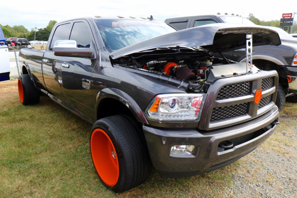 Here is a fourth-gen Cummins Ram with sporting aspirations with a lowered stance and sticky Continental sport tires wrapped around the bright orange Fuel Forged wheels. If you look closely you can also see the bright orange turbo under the hood that is possibly part of a compound setup.