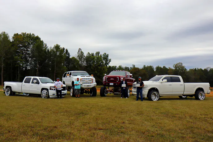 Here is the group of winners from the 2019 Rudy’s Fall Truck Jam with their trucks: from left to right Jeremy Roop—Best Duramax, Franklin Williams—Best In Show, Brad Linkie—Best Power Stroke and Zachary Zamudio—Best Cummins.