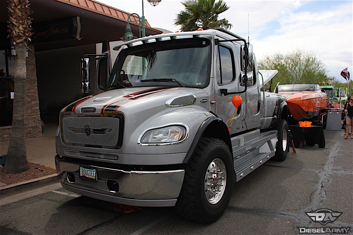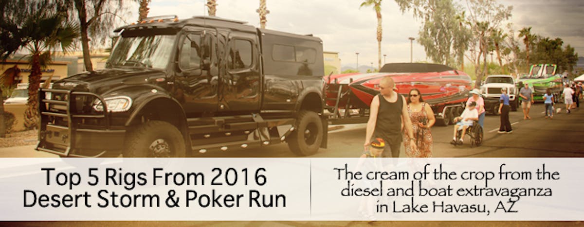 Part and parcel of the awesomeness are the boats and trucks that haul them. Watercraft lengths range from 20 to 50 feet in length, and when combined with a trailer, the load reaches well into the five-digit territory. That’s where diesel trucks step in and deliver with unmatched towing capability, and when they’re on display for a show like this, they’re all dolled up and looking fantastic. Here are the top five rigs from the 2016 Desert Storm and Poker Run.