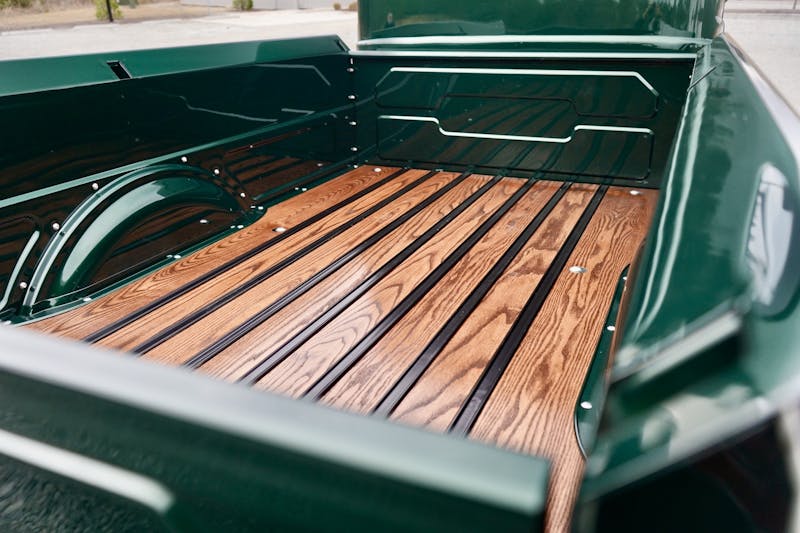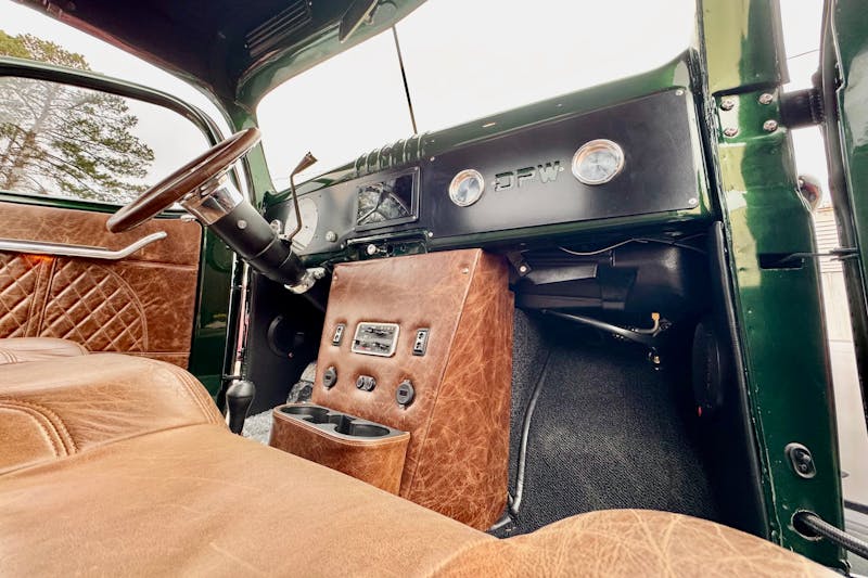 Inside, the craftsmanship continues. The “Distressed Pinecone” diamond-stitched leather interior is as comfortable as it is rugged. The workmanship extends to the beautiful oak wood bed floor with black steel slats. Vintage Air climate control keeps the cabin cool, while modern tech like Dakota Digital gauges and an Android-based Atoto infotainment system ensure the experience is anything but outdated. With Bluetooth connectivity, a Rockford Fosgate audio system, and even power windows, this rig offers modern technology without sacrificing its nostalgic heritage.