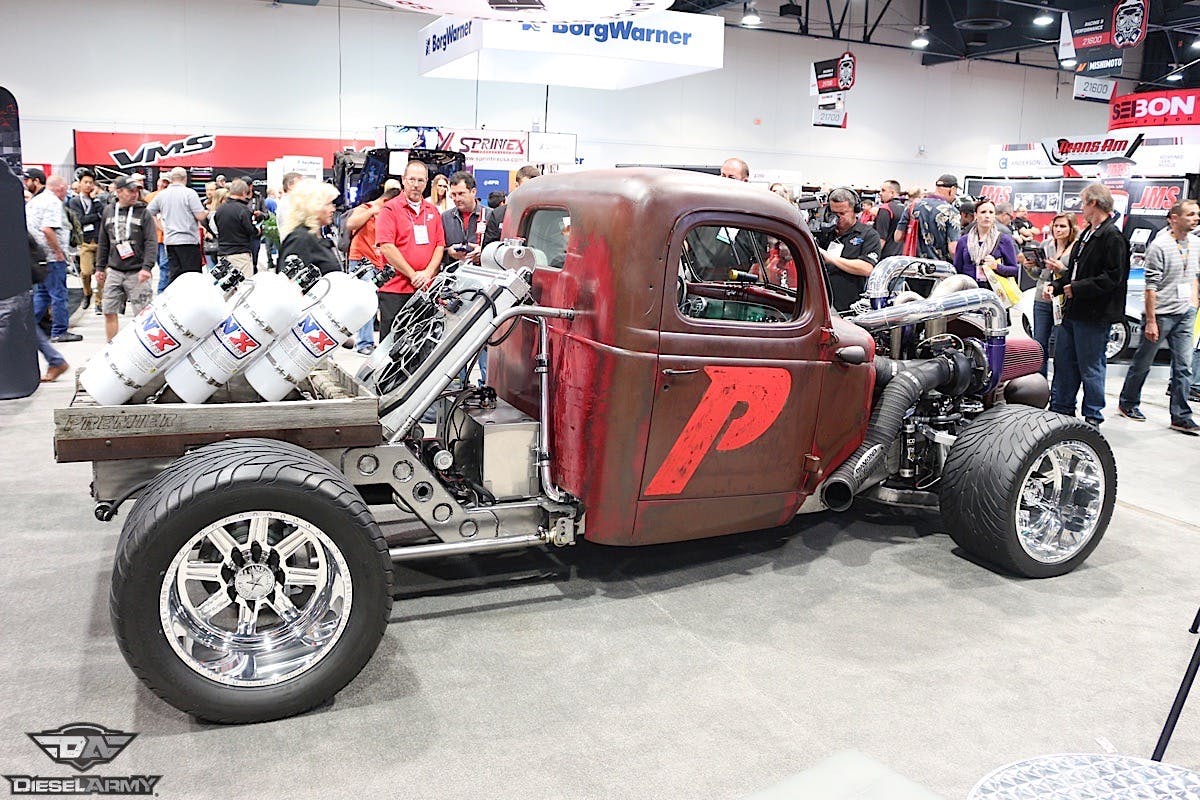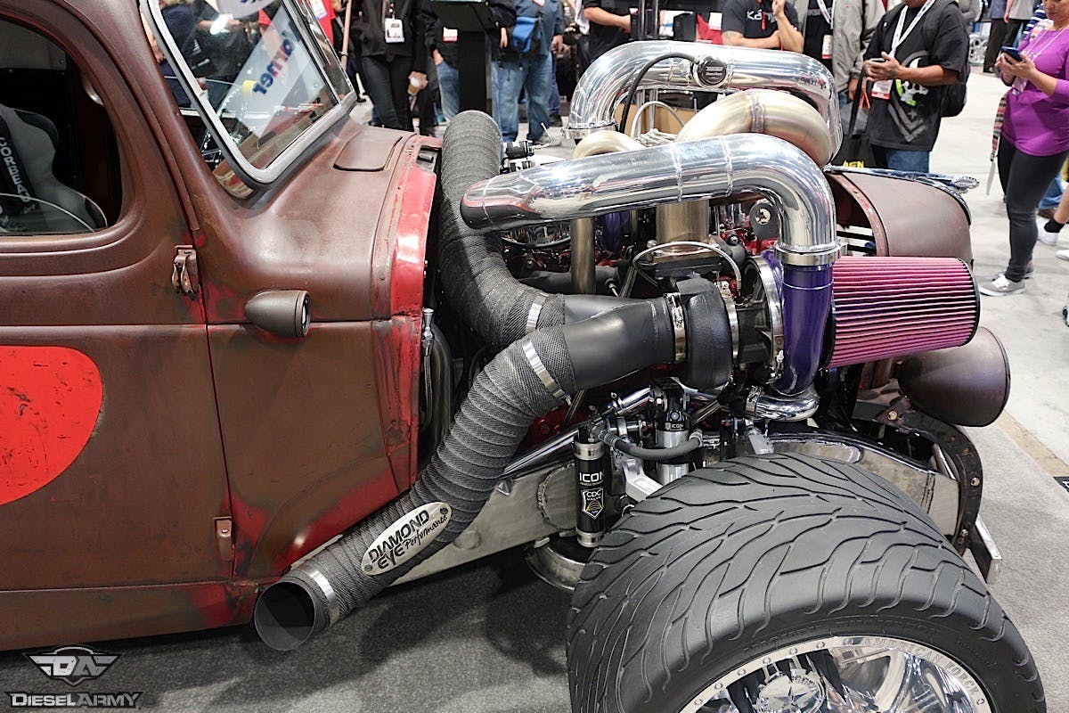 Walking through the halls of SEMA 2015 we stumbled across this monstrosity of metal, turbochargers, and nitrous oxide. With several diesel-powered rat rods at the show, this one stood out as unique. Rather than a super-low chopped roofline, straight I-beam front axle, and a single turbo exiting out a stack, this 1946 Dodge truck takes a different approach.