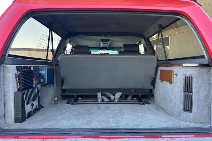Step inside, and the Centurion’s conversion magic really shines. Forget bare-bones pickup interiors. This one has gray leather middle-row captain’s chairs and a third-row bench seat—now that’s a mashup. There’s even a CRT television with a VCR, straight out of the family road-trip playbook. Add in a JVC head unit, Rockford Fosgate subwoofers, woodgrain trim, and overhead lighting, and you’ve got the ultimate ’90s luxury hauler. It’s part pickup, part SUV, and part time machine.