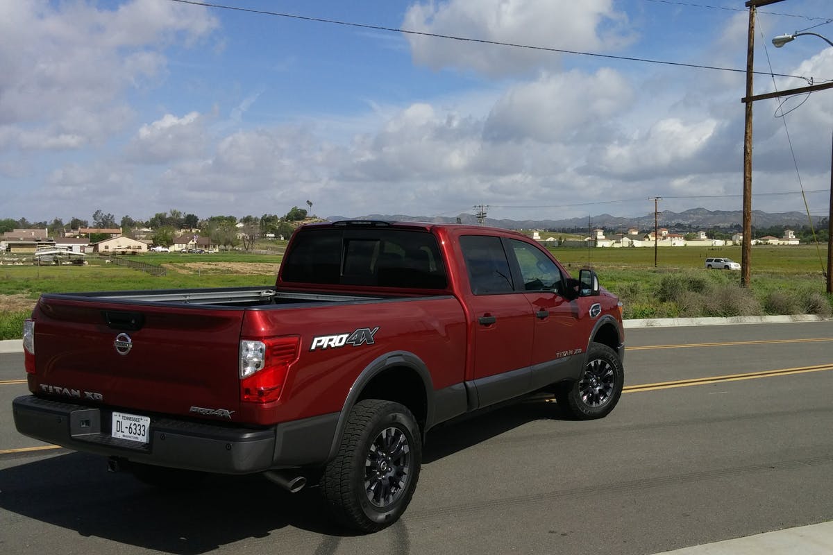 The 2016 Titan XD is available exclusively in a crew cab configuration, and comes in five trim levels ranging from the base model S to the ultra-luxe Platinum Reserve. The model we received was the middle-of-the-pack Pro-4X in a lovely burnt scarlet shade called Cayenne Red with a black leather interior.