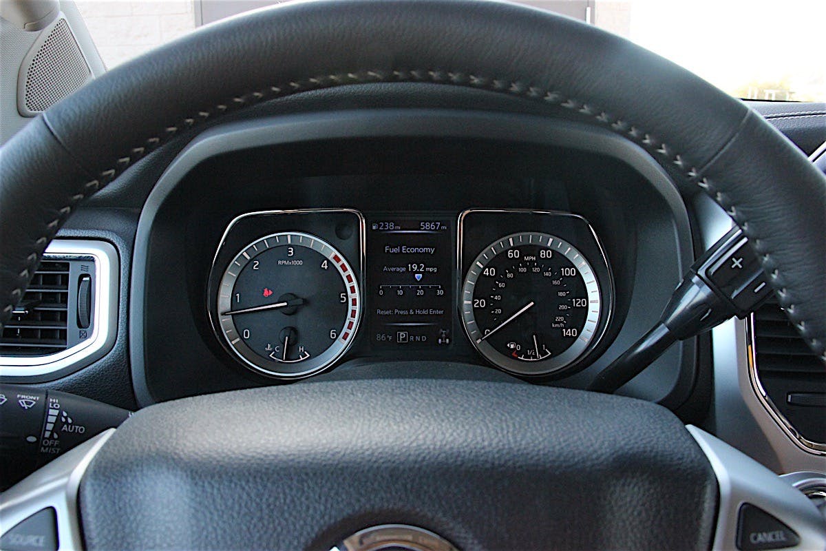Moving to the gauge cluster, Nissan made everything easy to read and comb through. Analog gauges told the speed, RPM, coolant temperature, and fuel level. Nestled in the middle, an LCD screen had multiple readouts that could be flipped through using the directional pad on the steering wheel. Digital clinometer, MPG reading, DEF level, music playlists, and more could be seen here.