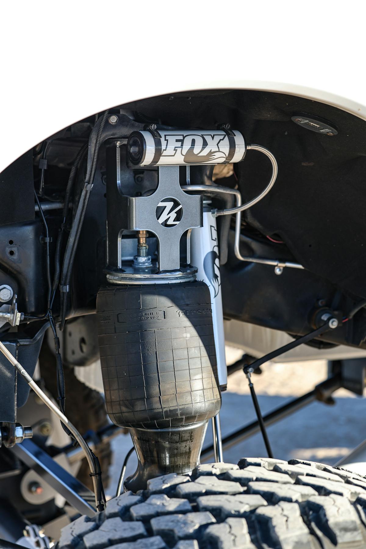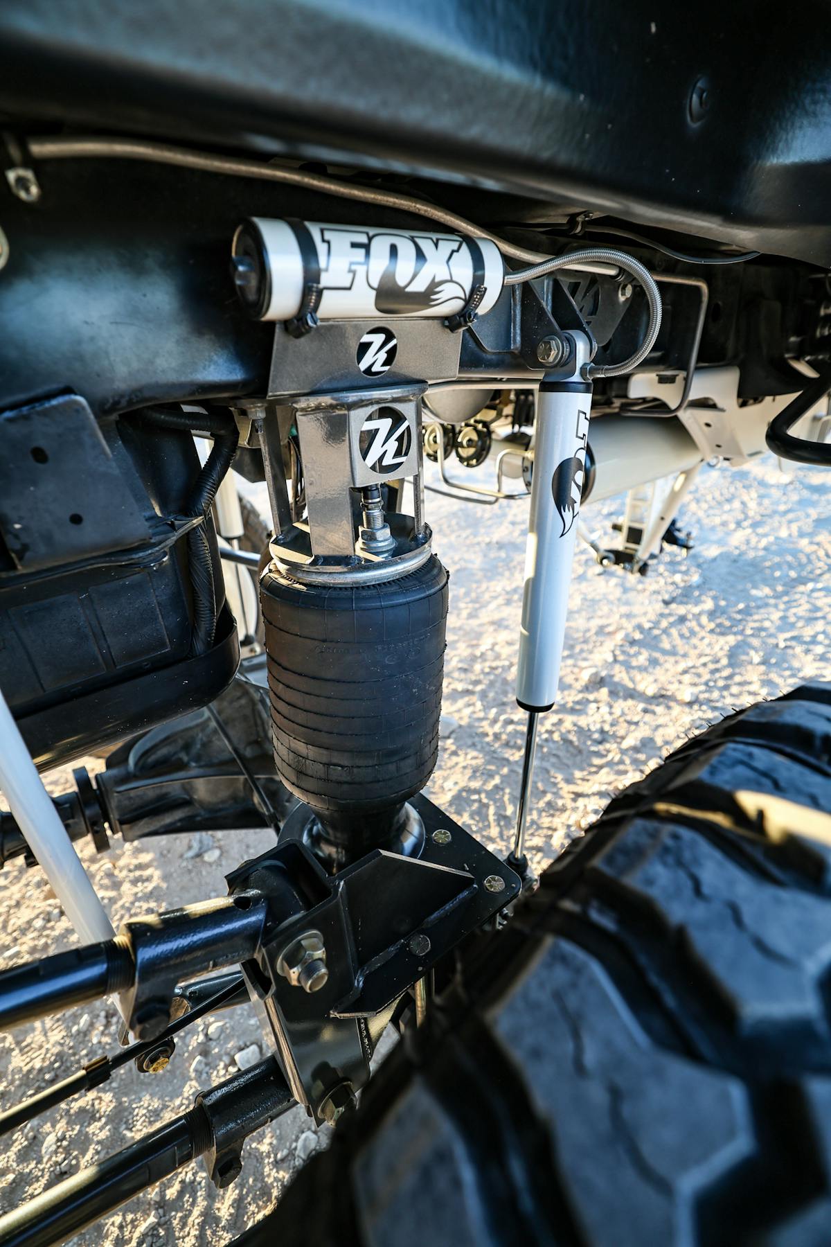 The stock brakes manage to halt these massive rollers, but of course they had to be color matched as well to tuck a little more custom into each corner. Not only is all the suspension powder coated white, but the AFE Power oil pan, transmission covers, and differential covers have all been coated to match.