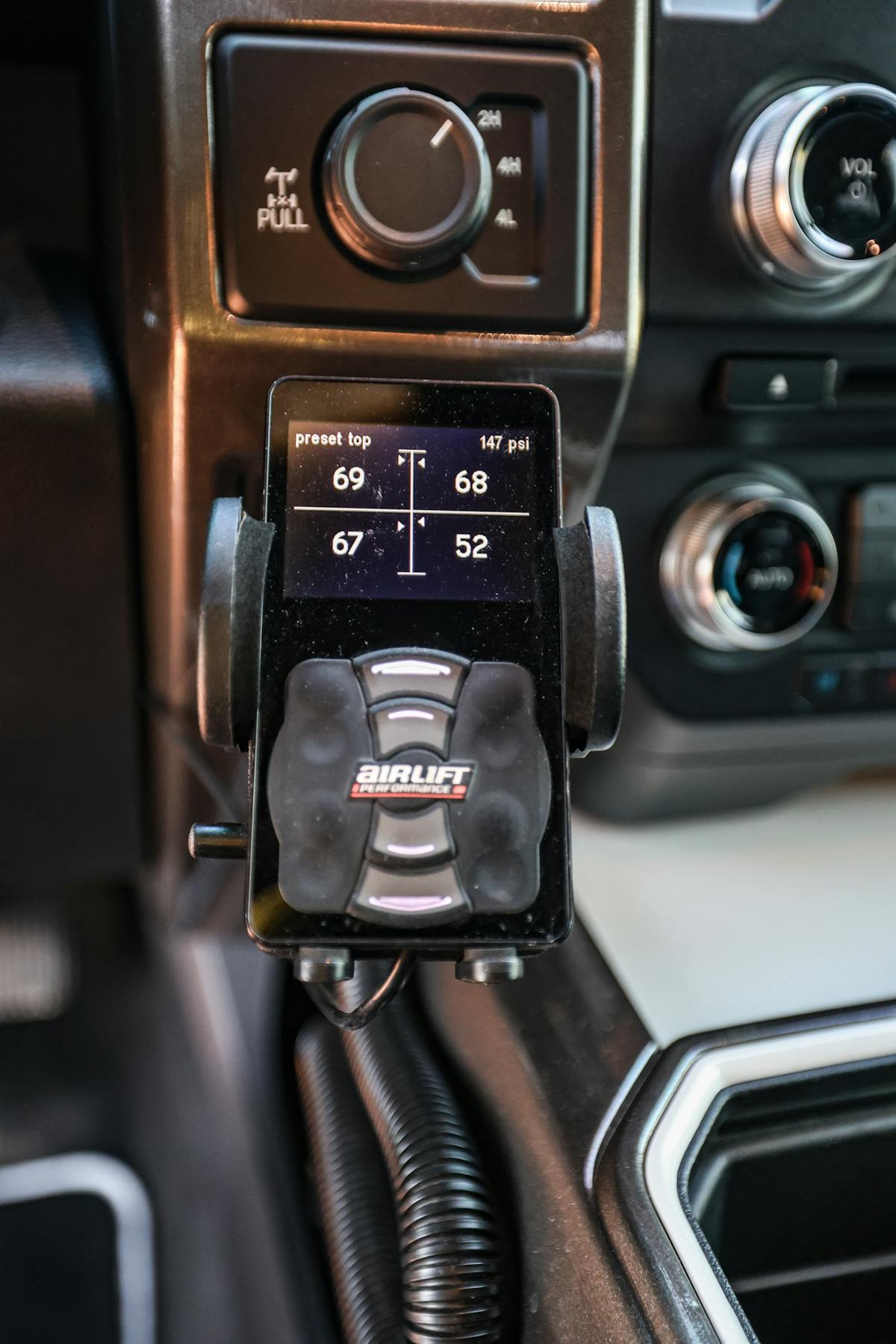 More practical upgrades like lighting came next. A set of Kelderman front and rear bumpers were added and stuffed with Rigid Industry lighting. The color matched headlights and Kelderman grille make sure the front end is as aggressive as it can be. Out back the Retrax electric bed cover and Bedrug keep the packages dry and secure in the bed when Kelli takes the truck shopping. Underneath, Hornblasters Shocker S6 train horns were installed once they were color matched as well.