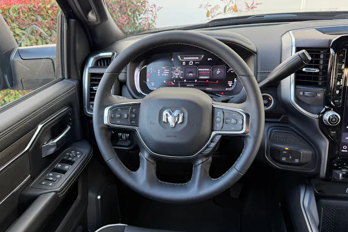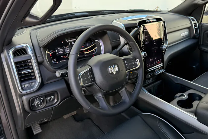 Ram continues to offer one of the cleanest cockpits in the business. Behind the heated steering wheel, notice the 12.3-inch digital cluster display that offered colorful 3D graphics, vehicle information, navigation commands, and tons of customization capability. If you’re looking for a mid-level trim with big-screen capability, the Laramie is a good option.
