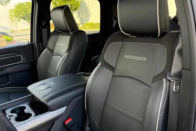 Our tested was optioned with the Black interior color, a no-fuss palette that complied with the rigors of daily life. There’s another no-charge interior option called Bison Brown/Sea Salt. The leather-trimmed front heated bucket seats were comfortable and supportive thanks to eight–way power adjustable functionality. White piping and white stitching complemented the Laramie seatback lettering.