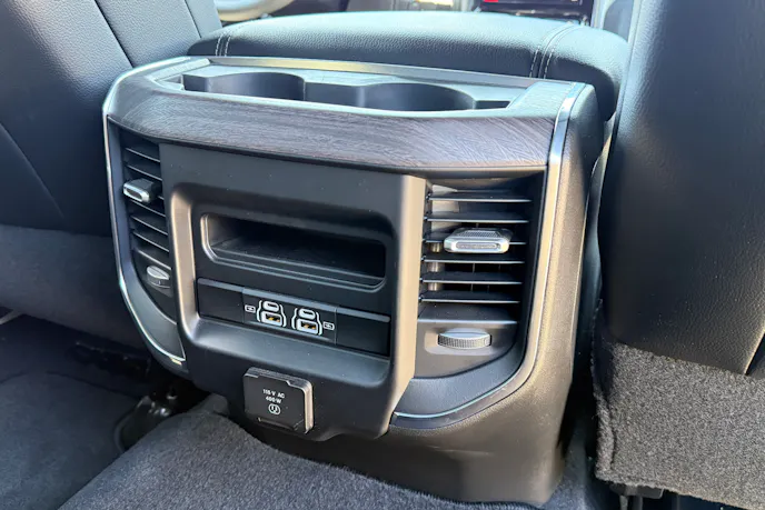 The rear console had air vents on the sides, a small Center Console Rear Cubby Bin (as Ram called it) for smaller items, a 115-volt AC outlet, and dual USB-A and USB-C ports. The driver and front passenger had their own USB-A and USB-C ports as well, along with a 115-volt AC outlet. We really liked that Ram included so many of both port types—especially USB-C.