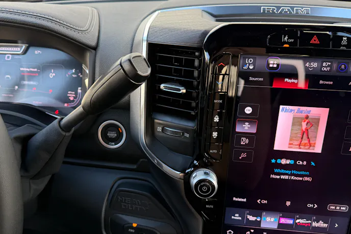 The column gear shifter remained but had a lightweight electronic feel thanks to the new eight-speed transmission. Despite the large screen, Ram retained physical buttons for dual-zone HVAC functions and a prominent volume knob for the sound system. For instant silence, there was a convenient mute button underneath the volume knob. The start/stop button was isolated from other buttons, so you shouldn’t be tempted to reach for it at the wrong time.