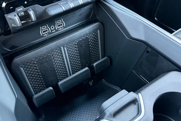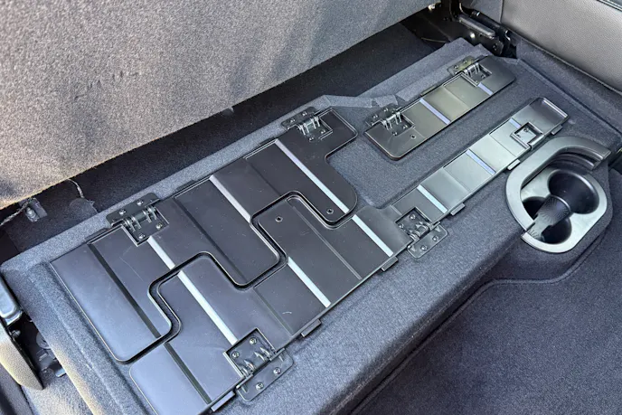 Underneath the sliding console tray and the main console, you’ll find a cavernous storage area. On one adventure, we stored a laptop in this space and fully concealed it by moving the tray completely forward toward the wireless charging pad. Too bad the tray doesn’t lock. Despite this, the movable tray acted like a retractable lid that could completely expose or completely conceal the contents below. The center console setup is hard to explain, so check out the pictures to see what we’re talking about.