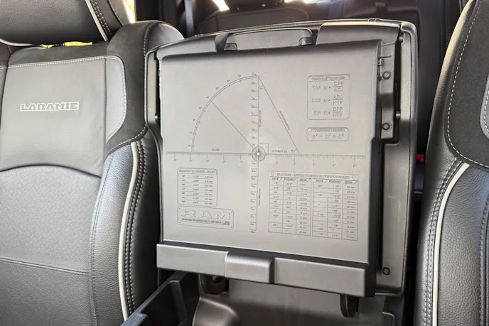 The Laramie Level 1 Plus Equipment Group ($1,795) added some interior goodies that we appreciated: dual wireless charging pad, leather-trimmed bucket seats, power adjustable pedals with memory, adaptive steering system, rain–sensitive windshield wipers, and the second-row In-Floor Storage Bins. As for additional technology, it brought: Traffic Sign Recognition, Drowsy Driver Detection, and Active Lane-Management System. The Level 1 Plus brought tow mirrors with maximum functionality. As for the cargo area, the group added: remote tailgate release, center stop lamp with cargo-view camera, LED bed lighting, deployable bed-step by Mopar, and a spray-in bedliner by Mopar. As for performance, the package added an anti-spin differential rear axle. We’ll talk about some of these things in greater detail.