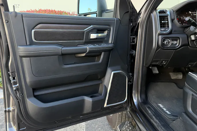 With lots of functional storage and a water bottle holder, the soft-touch door panel exemplified the classiness for which Ram interiors are known. It showed a palatable blend of textures and colors without going overboard by mixing every shade of black, tan, and beige. The large door handle was easy to find and use. The power front windows had one-touch up/down functionality.