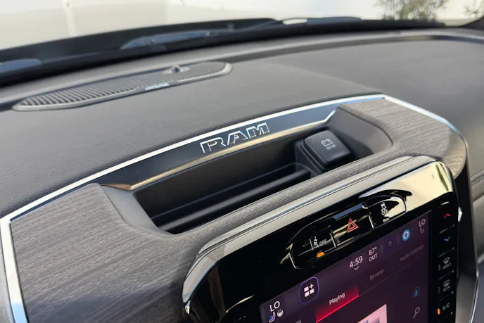 This Laramie was equipped with Uconnect 5 Nav with the higher-resolution 12.0-inch touchscreen display. It had SiriusXM 360L along with wireless Apple CarPlay and Google Android Auto. We’re somewhat embarrassed you caught us listening to Whitney Houston on SiriusXM. Although the touchscreen looked giant, it wasn’t even the new 14.4-inch screen that’s optional for the Laramie for 2025. Did we feel like we missed out? No. The Laramie does not get the 10.25-inch interactive passenger display that’s also new for 2025 on top trims. There was a fun little storage cubby in the dashboard atop the screen.