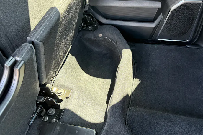 This Laramie had Ram’s class-exclusive Fold-Flat Load Floor with Under-Seat Storage. If you flip the rear seats up, you’ll find a roomy storage cubby underneath the driver side and components (subwoofer and amp) for the nine-speaker Alpine system under the passenger side. The Fold-Flat Load Floor Storage system was pretty self-explanatory: a bi-fold panel flaps over into the footwell and supports itself (via support brackets) to form a flat storage area.