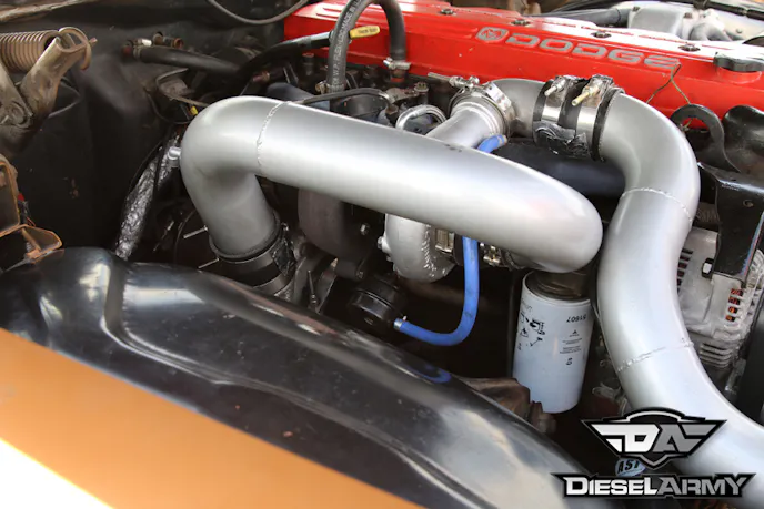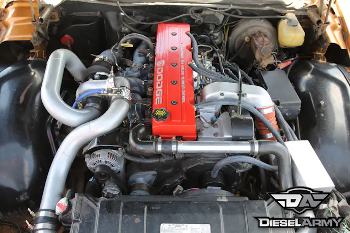 The engine is tuned with a TST PowerMax Competition module and it is paired with an Accel diesel timing box. Behind the engine, is a 47RE out of the same ’99 3500. The transmission was sent to Texas Performance Diesel and it features a Pro Street Diesel valve body. Before installing the transmission, a Diesel Performance Converters (DPC) triple disk converter was installed (stock stall).