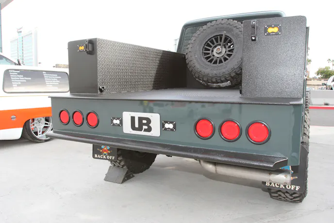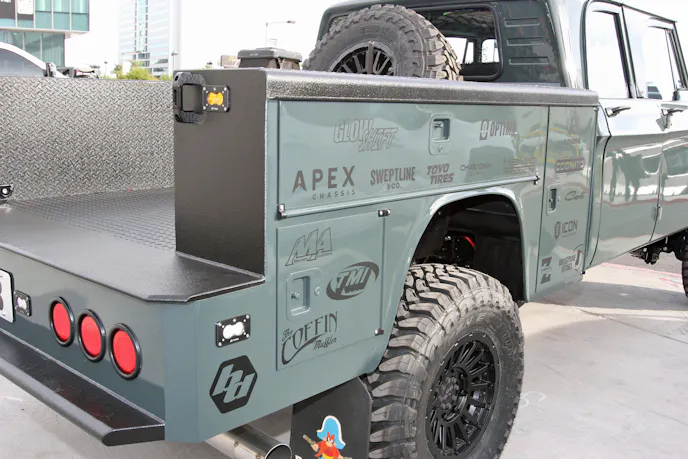 The Ford chassis was shortened by 8.5 inches to match the Dodge body. Once everything was aligned, Zach built a custom 12-inch high-clearance rear service-bed bumper and modified the service bed’s wheel arches. Additional upgrades include a custom front bumper, Baja Designs lighting, and a coat of Chevy Cypress Gray paint.