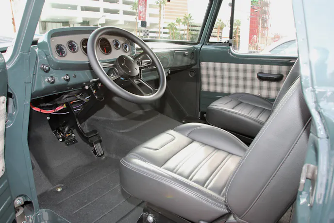 Inside, the truck blends old-school character with modern usability. TMI front and rear seats provide comfort, while GlowShift gauges are integrated into the factory dash. A modified factory steering column is paired with a Peterbilt-application steering wheel, adding a unique heavy-duty touch.