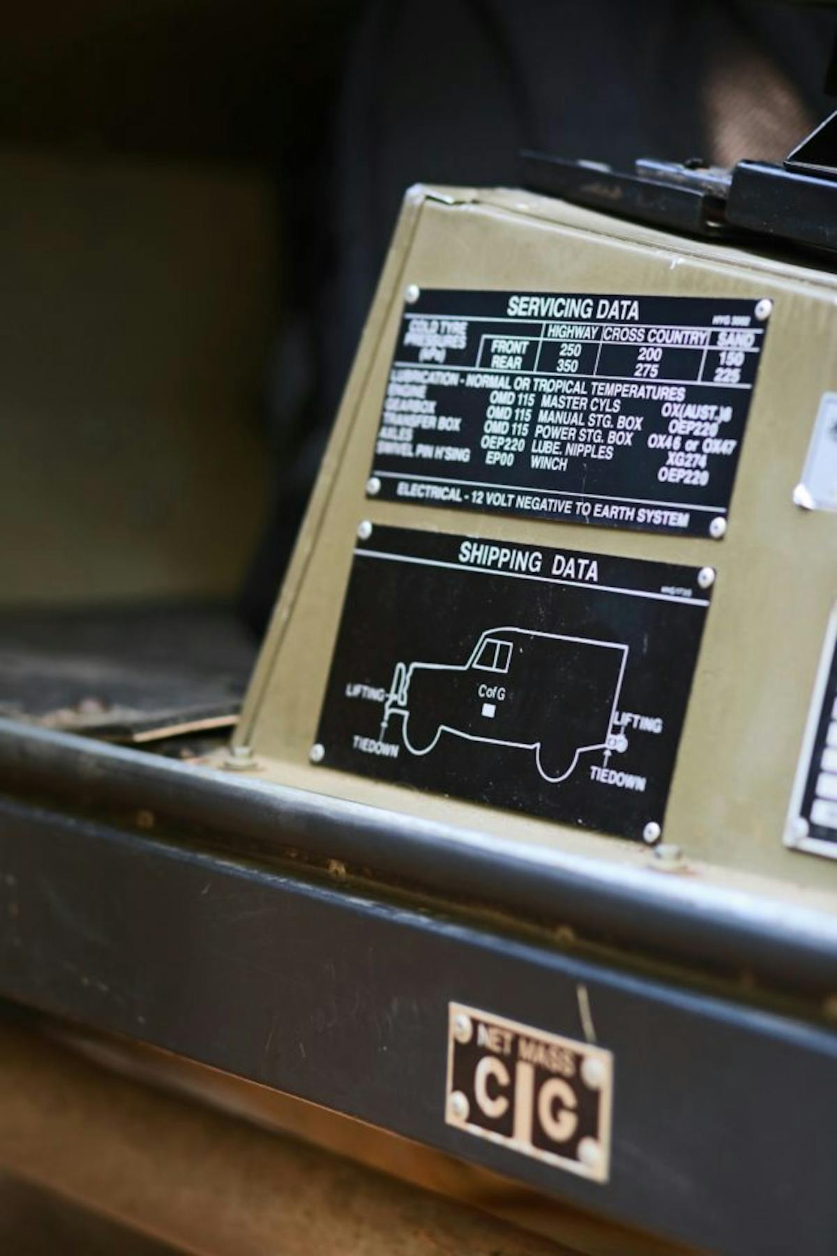 The large hooks in the front and rear that are used for recovery as well as transport by air. On both sides of the rocker panel, they have marked the center of gravity (C/G). They have this marked so they can fix the rigging to have a helicopter lift the truck to drop it anywhere they need or they can easily lift it with a crane to load it onto a cargo ship.