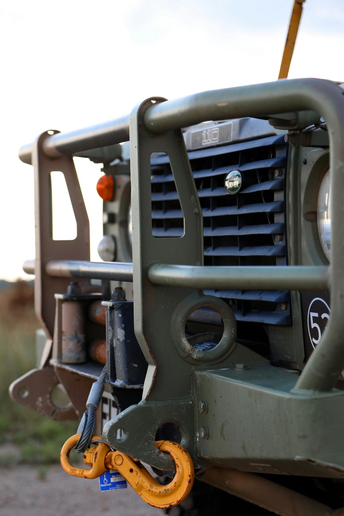 The large hooks in the front and rear that are used for recovery as well as transport by air. On both sides of the rocker panel, they have marked the center of gravity (C/G). They have this marked so they can fix the rigging to have a helicopter lift the truck to drop it anywhere they need or they can easily lift it with a crane to load it onto a cargo ship.