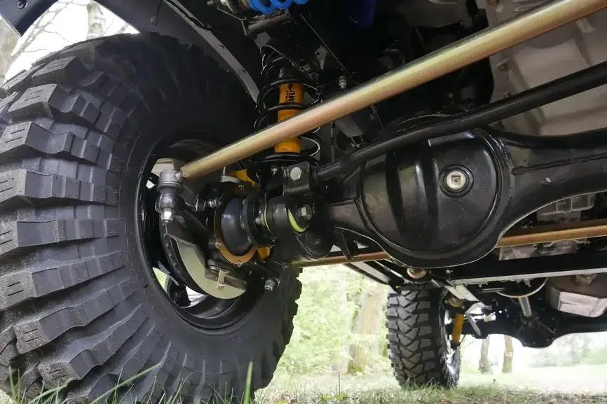 Suspending the Defender is a 2-inch ARB lift kit that features Old Man Emu shocks and springs. Rolling stock includes 16-inch Spectre wheels with 35-inch Maxxis Trepador tires. Brakes and steering gear have been replaced as well.