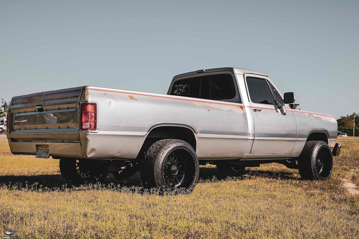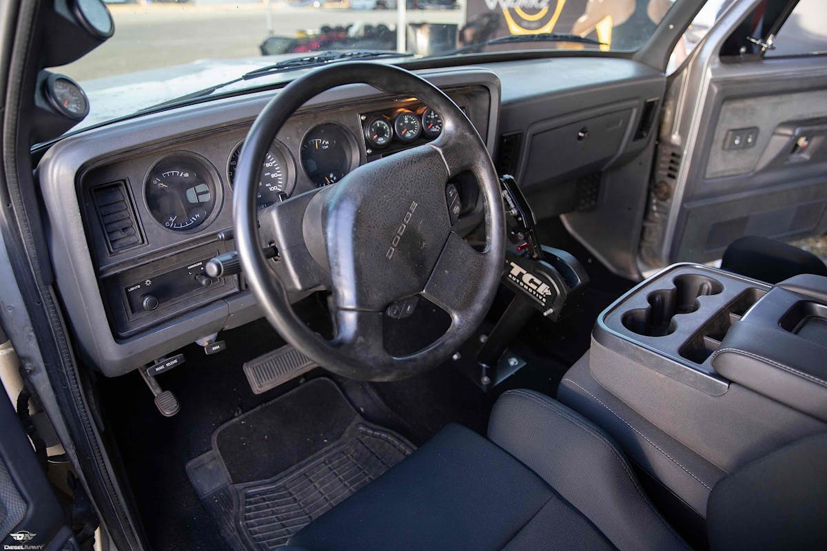 Backing the powerplant in this first-gen Ram is the Muldoon’s Diesel Stage 448RE with a Suncoast stubby output shaft. Alberalla controls its every move with a full-manual valve body and ratchet shifter. The rest of the driveline is held in tight with custom 1480 U-joints and driveshaft, and the transmission is kept cool with a Derale cooler. For suspension, the first-gen uses the Dana 80 swap with a spool, SCS Gearbox axles and drive flanges, and a set of Calvert Racing traction bars.
