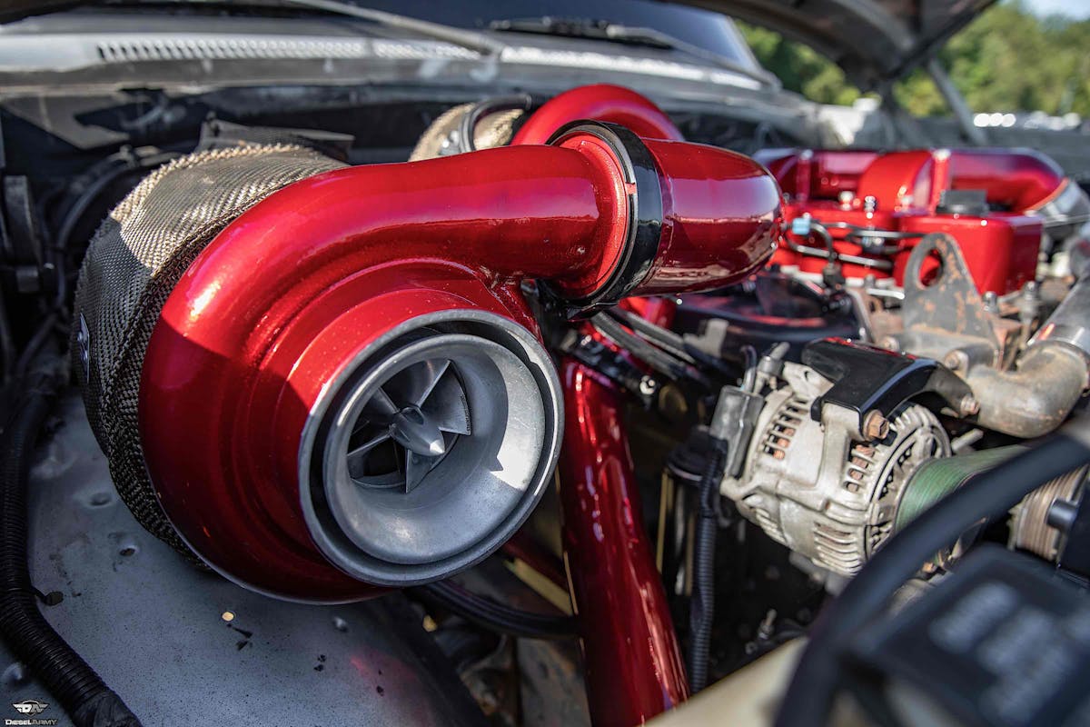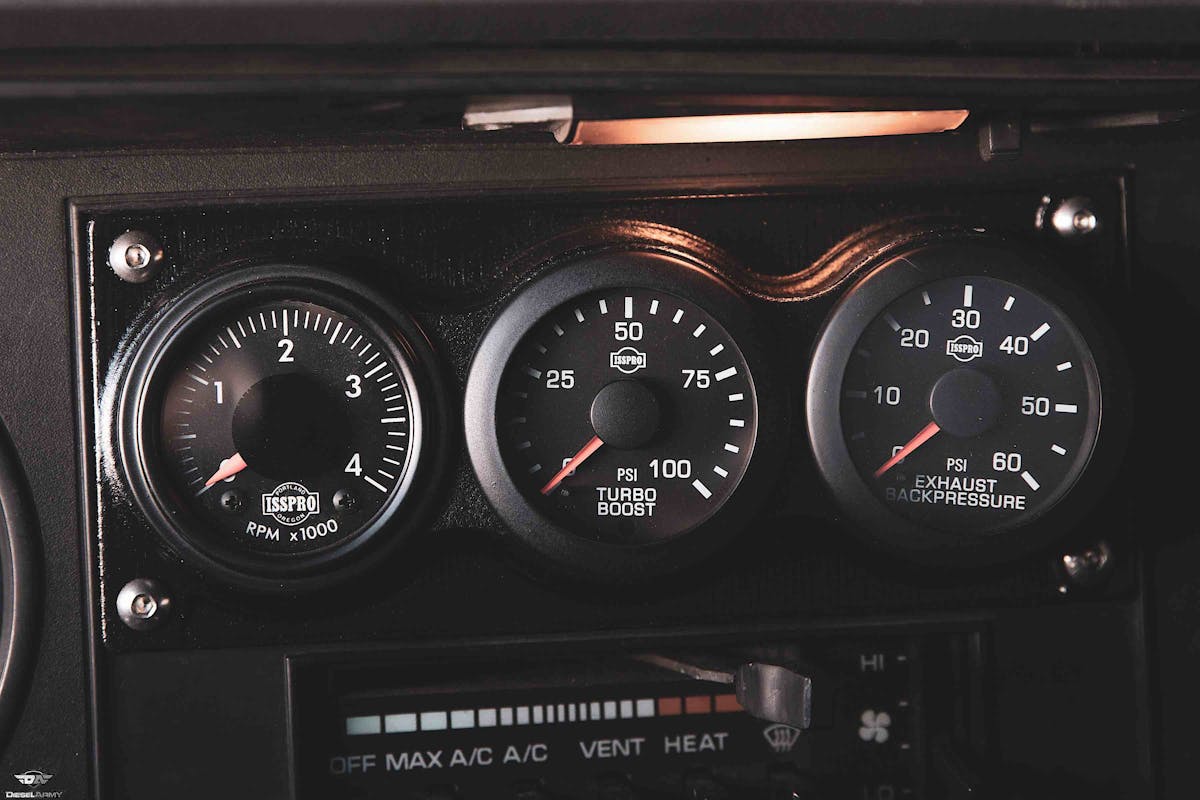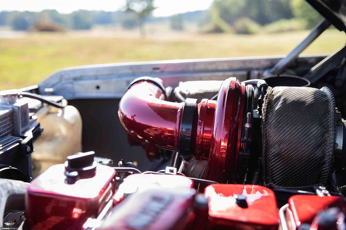 He continues, “We’ve replaced the VE injection pump with the far superior Farrell Diesel 12-MM P-Pump, a set of Stainless Diesel five-blade compound turbochargers, and swapped a Dana 80 rear differential into it. At this level, she is cranking out around 800 horsepower and has a personal best track time of 11.24 seconds in the quarter-mile.”