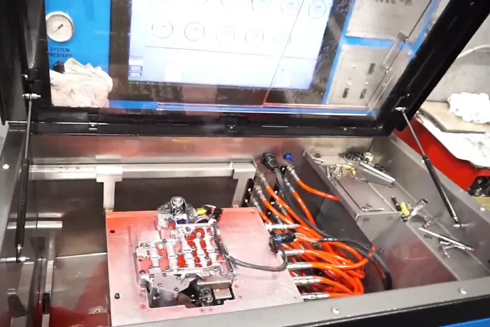 The walk-through covered every aspect of the RevMax operation. Starting in the showroom displaying finished products and cutaways, the tour moved through the offices into the production areas. Viewers got to see the dedicated valve body build area, complete with an in-house valve body dyno for testing. The tour continued through the transmission and torque converter assembly areas, showcasing the balancing and pressure-checking equipment. An important portion highlighted the extensive machining department, featuring manual lathes and a large CNC area where RevMax manufactures its own billet components, like channel plates and shafts, from raw stock.
