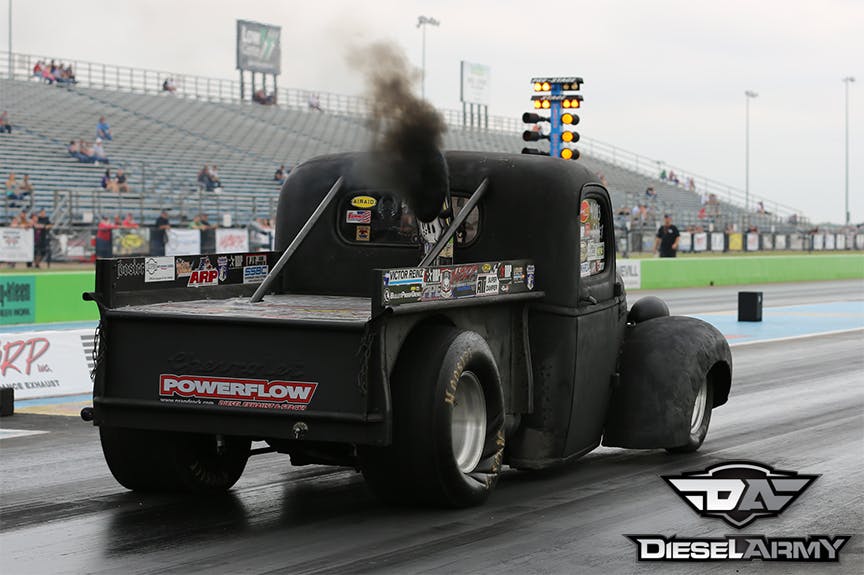 Instead of running a big expensive injection pump, Brarens knew that a truck this light (3,010 pounds) didn’t need a ton of power to go fast (runs 11.30 at 116 mph in the 1/4). So, he modified the fuel pin and upgraded the governor spring. For injectors, he opted to go with a set of Stage 3 injectors. To supply enough air for this setup, he upgraded to a HE351 Holset turbocharger. The turbocharger runs through an intercooler he found on an old Isuzu cabover truck. Outback a 7-inch Assie stack from Powerflow was the perfect choice.