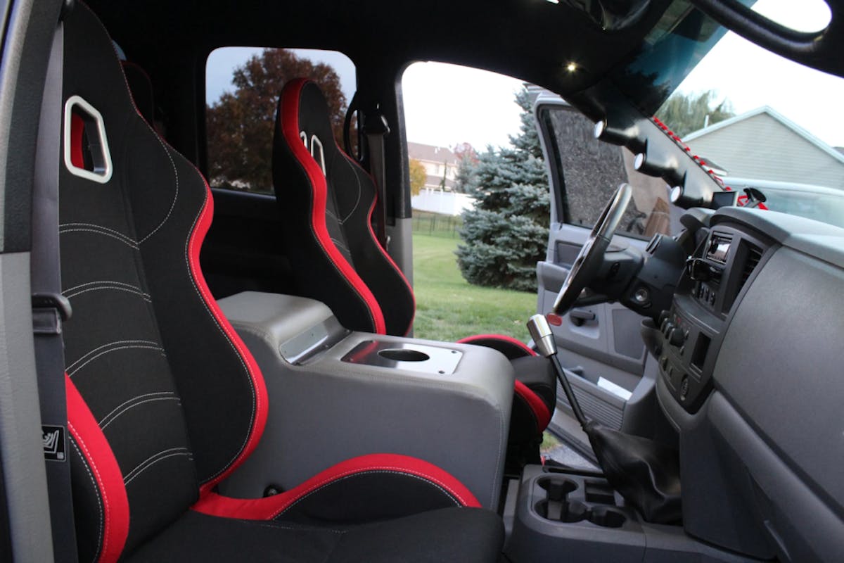 On the inside of the Ram cockpit, there are ISSPRO factory matched gauges reading boost, EGT, drive pressure, and fuel rail pressure. Spiking out these gauges are the Calibrated Addiction EFI Live tunes. Durf uses an Edge Products Insight CTS2 monitor for additional parameters. Driving fast and watching all the flashing lights is made easy with some comfort modifications.