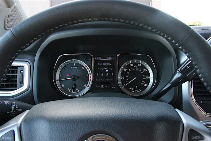 Moving to the gauge cluster, Nissan made everything easy to read and comb through. Analog gauges told the speed, RPM, coolant temperature, and fuel level. Nestled in the middle, an LCD screen had multiple readouts that could be flipped through using the directional pad on the steering wheel. Digital clinometer, MPG reading, DEF level, music playlists, and more could be seen here.