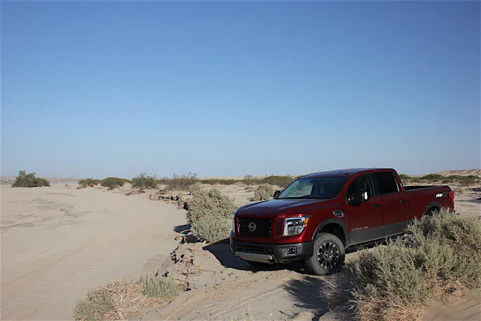Going up and down dunes was tricky, as we felt uncomfortable about the entry angle. The aforementioned skidplate and pair of tow hooks made going over certain sections a bad idea, but we still enjoyed getting to explore the further reaches of the SVRA landscape. With a modified bumper and some higher-travel shocks, we could even see the Titan XD as a badass diesel prerunner someday. For now, however, the truck is best left to carrying bikes and trailers with actual off-road vehicles.